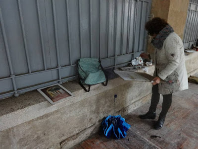 por la lluvia, el grupo de Acuarelistas se ha refugiado bajo los soportales de
